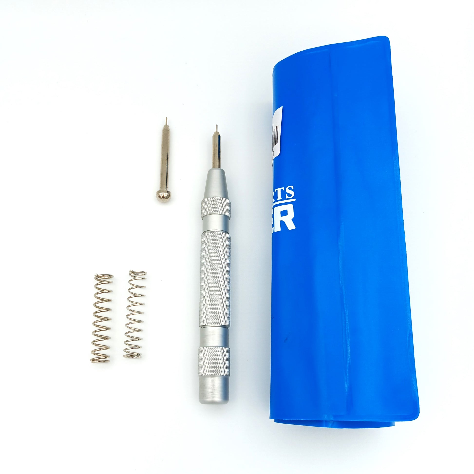 Iskupiikki 0.8mm paksuisella piikillä rannekkeen tappien poistamiseen. Puristustiukkuudella asennettujen tappien irrotus onnistuu ilman vasaraa työkalun jousimekanismin ansiosta.
