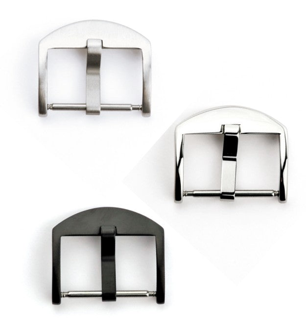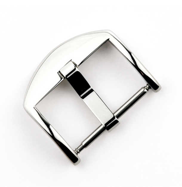 Kiiltävä teräs solki nähtävissä asennettuna Ohio -rannekkeen tuotekuvassa.