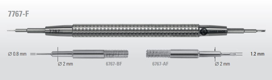 Koko pituudelta karhennettu varsi takaa hyvän ja pitävän otteen. Mukana tulee 1,2mm levyinen haarukan muotoinen kärki jolla saa napakan otteen jousinastasta sekä yksi kärki 0,8mm tapilla, jolla saa käsiteltyä jousinastaa sen päädystä. Kärjet kiinnittyvät varteen kierteellä
