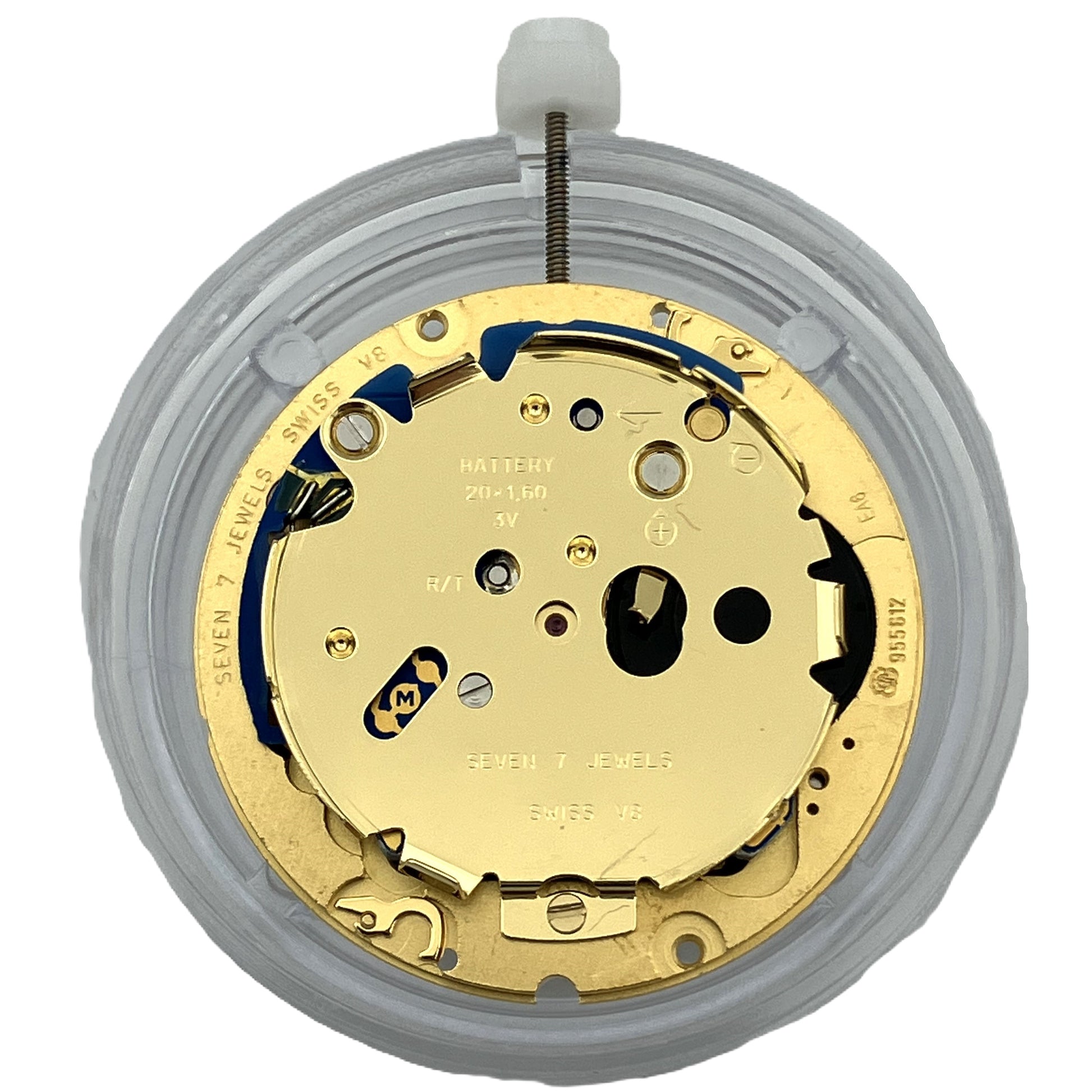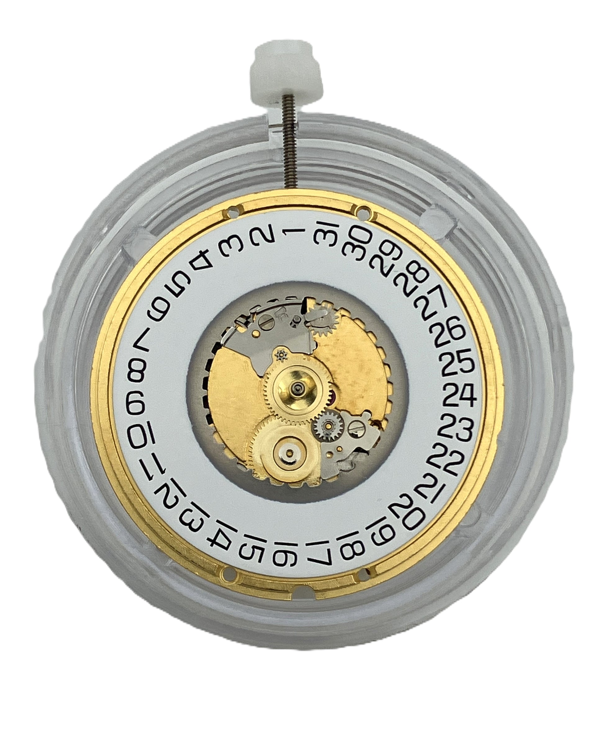 ETA 955.612 -kvartsikoneisto tunti-, minuutti- ja sekuntiosoittimella. Päivyrikiekko on valkoisella pohjalla ja mustilla numeroilla.