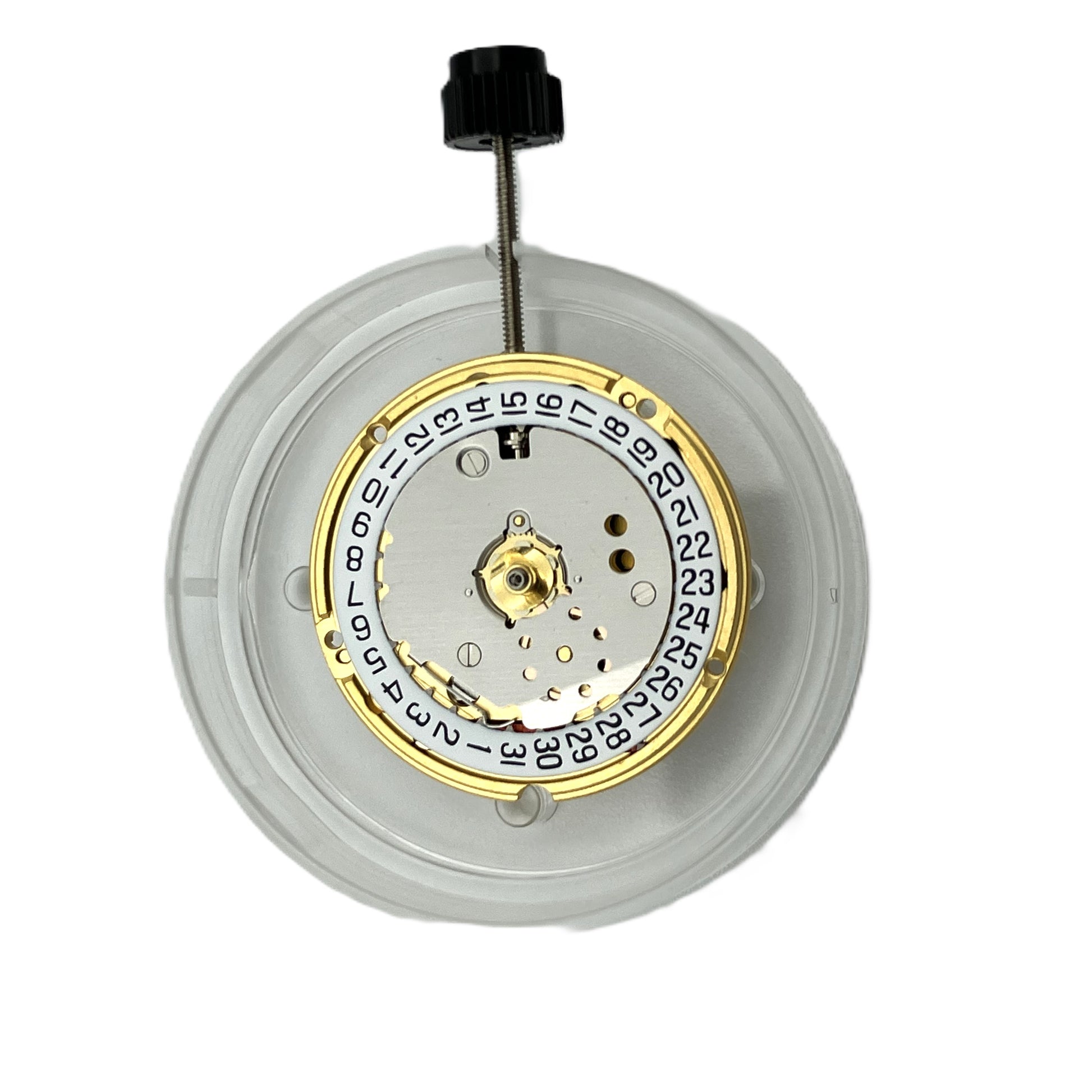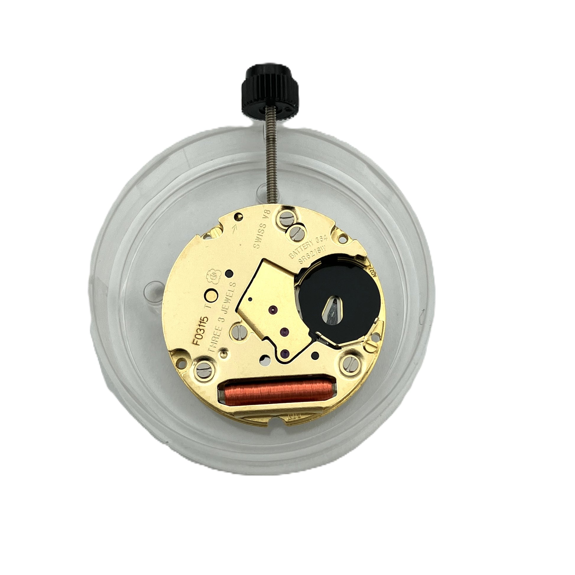 ETA F03.115 -kvartsikoneisto tunti-, minuutti- ja keskisekuntiosoittimella. Päivyrikiekko on valkoisella pohjalla ja mustilla numeroilla. Korvaava koneisto F03.111:lle.