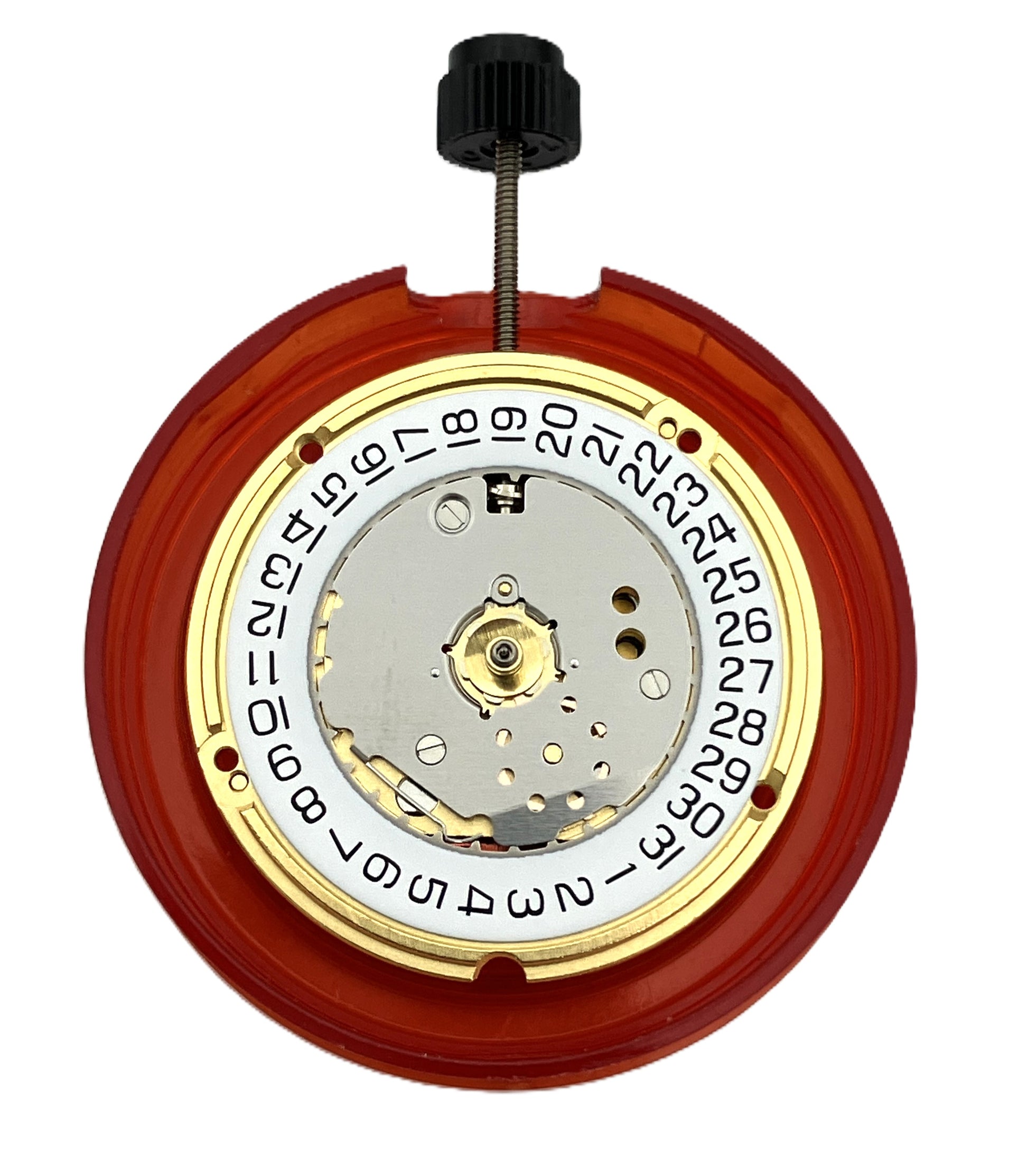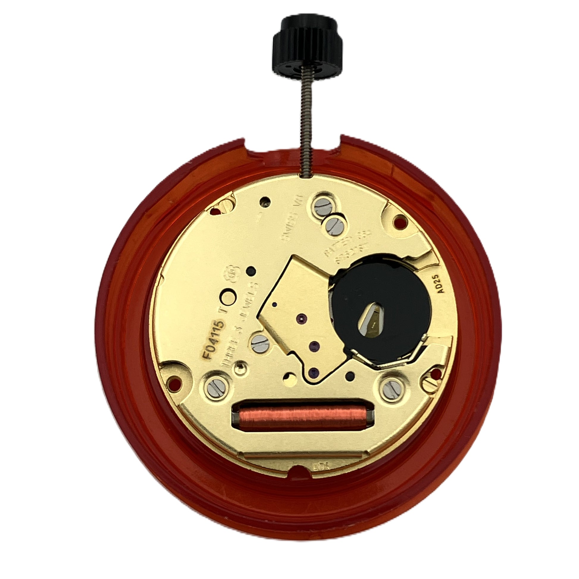 ETA F04.115 -kvartsikoneisto tunti-, minuutti- ja keskisekuntiosoittimella. Päivyrikiekko on valkoisella pohjalla ja mustilla numeroilla. Korvaava koneisto F04.111:lle.