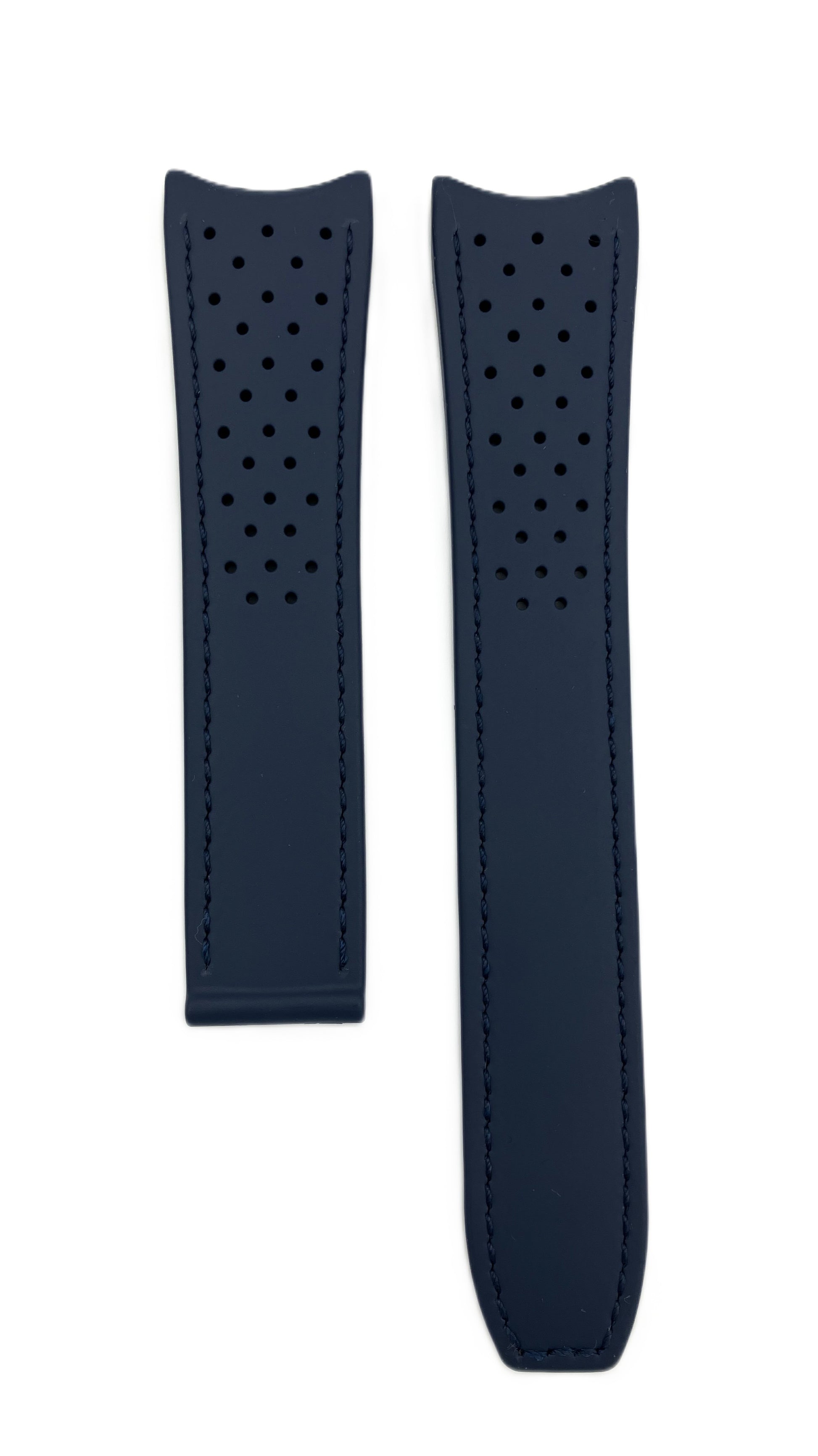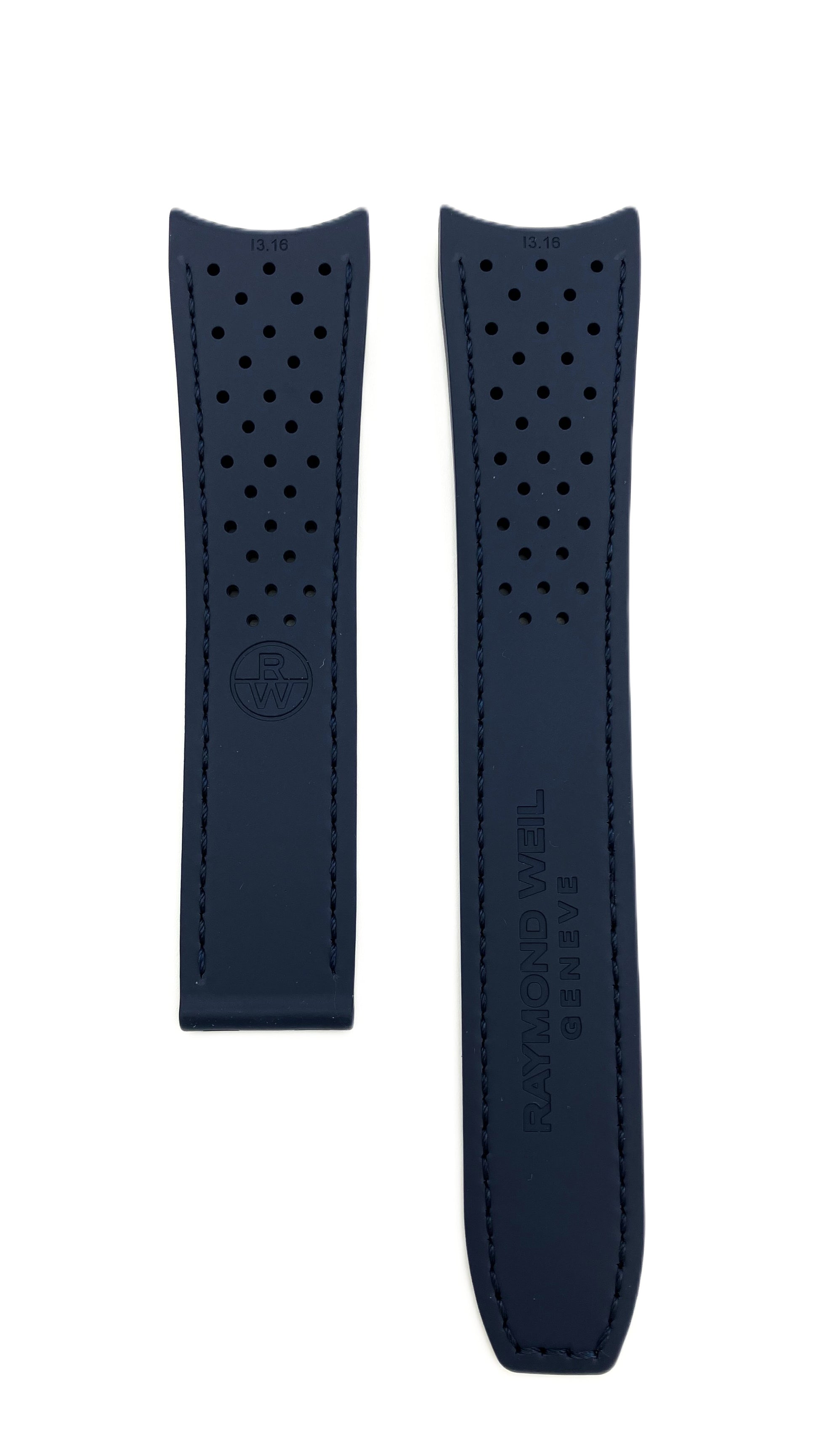 Raymond Weil 2760-SR3-50001 alkuperäinen tumman sininen kumiranneke ilman lukkoa. Rannekkeessa on kaarevat päädyt ja siniset tikkaukset. Alkuperäiset kaarevat jousinastat toimitetaan rannekkeen mukana.