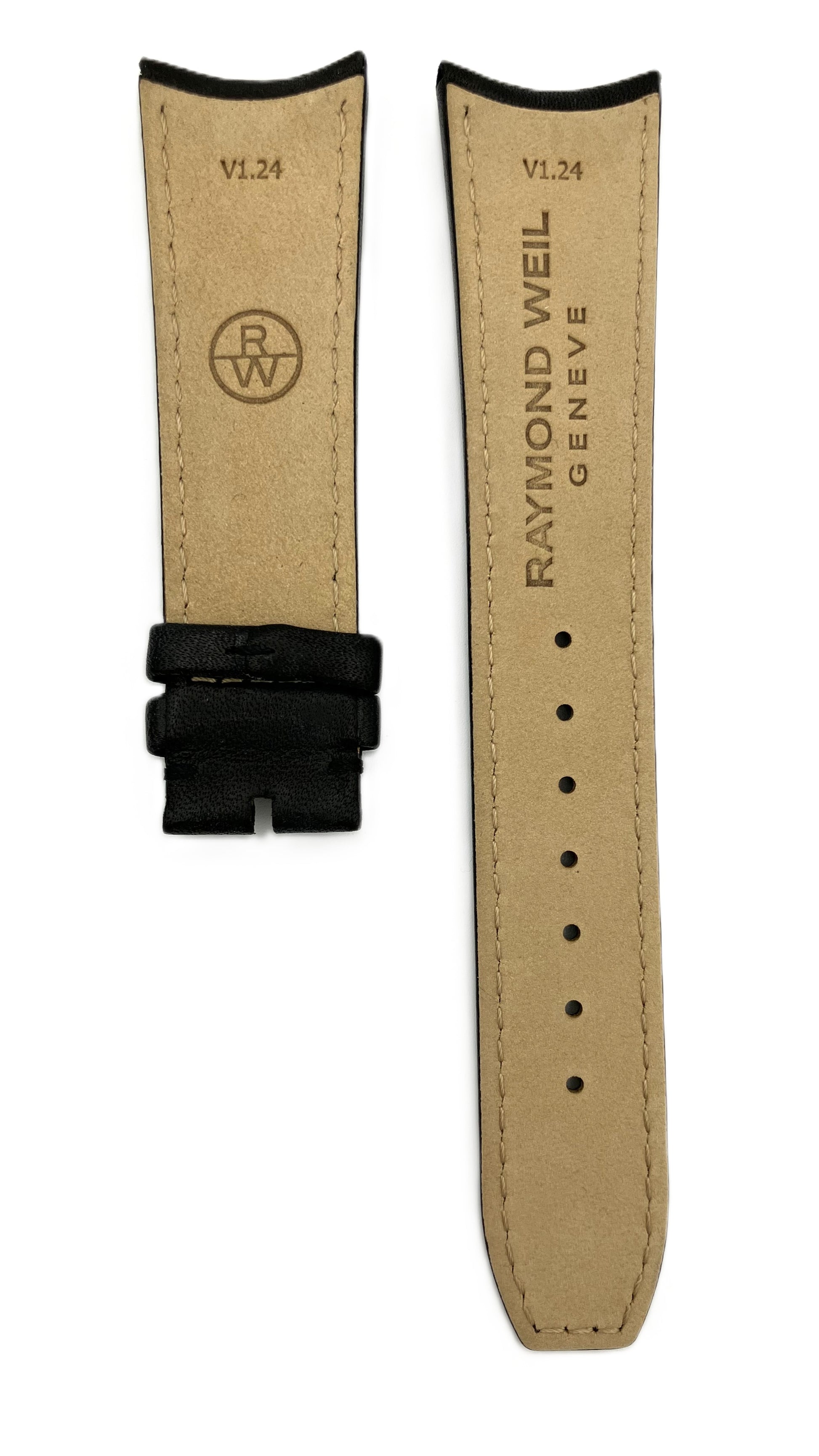 Alkuperäinen Raymond Weil Freelancer musta nahkaranneke ilman lukkoa. Rannekkeessa on kaarevat päädyt ja mustat tikkaukset. Alkuperäiset kaarevat jousinastat toimitetaan rannekkeen mukana.