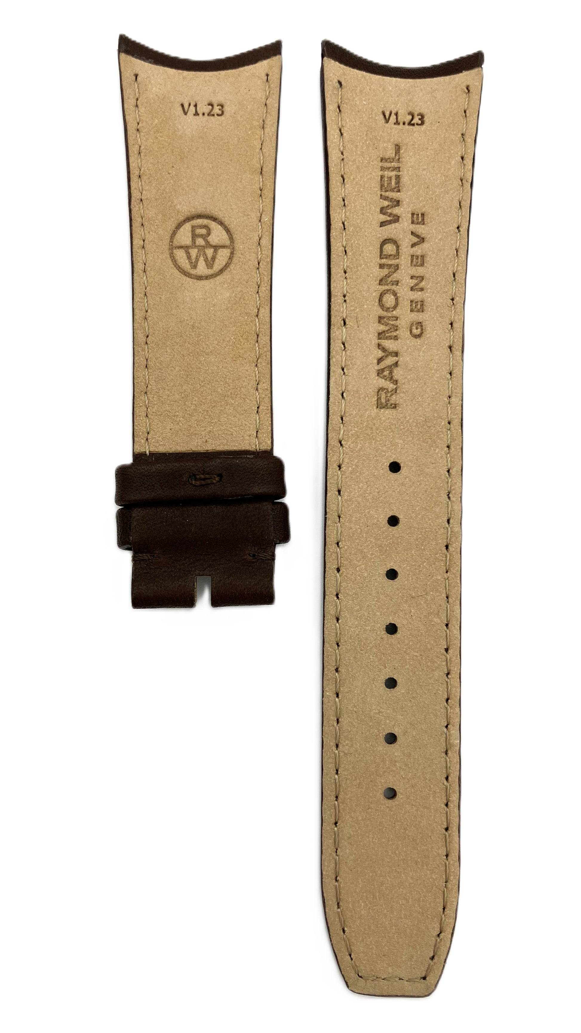 Alkuperäinen Raymond Weil Freelancer ruskea nahkaranneke ilman lukkoa. Rannekkeessa on kaarevat päädyt ja ruskeat tikkaukset. Alkuperäiset kaarevat jousinastat toimitetaan rannekkeen mukana.