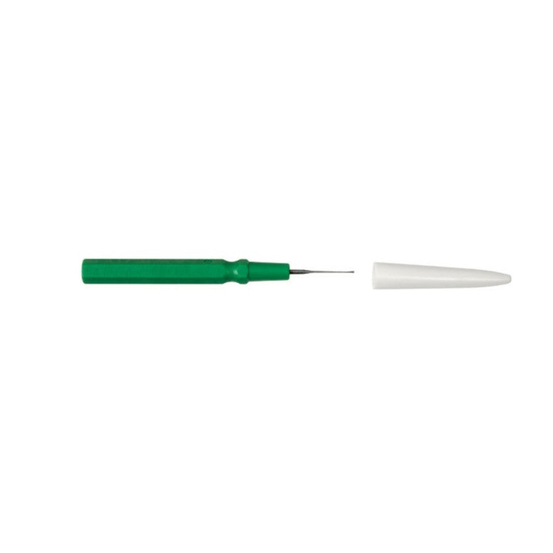 Leveällä kärjellä varustettu öljyneula muovista valmistetulla vihreällä varrella.