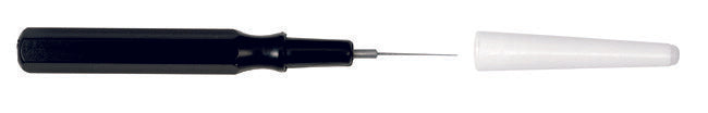 Pienellä kärjellä varustettu öljyneula muovista valmistetulla mustalla varrella.