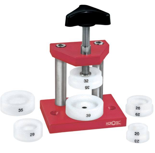 Kompakti ja vakaa puristin painopohjaisten kellojen takapohjien sulkemiseen sekä lasien ja lasisarjojen asennukseen.