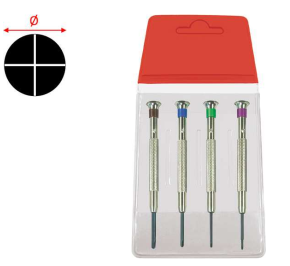 Ristipääruuvimeisselit 4kpl muovipussukassa. Varsi on kromattua messinkiä ja eri värimerkinnät ilmaisevat ruuvimeisselin kärjen halkaisijan. Varren yläosassa oleva reikä mahdollistaa ripustamisen tai kiristysvarren asettamisen. Ruuvimeisseleiden valmistus ja lämpökäsittely ovat erityisen siistit, jotta voidaan varmistaa hyvä vastustuskyky.