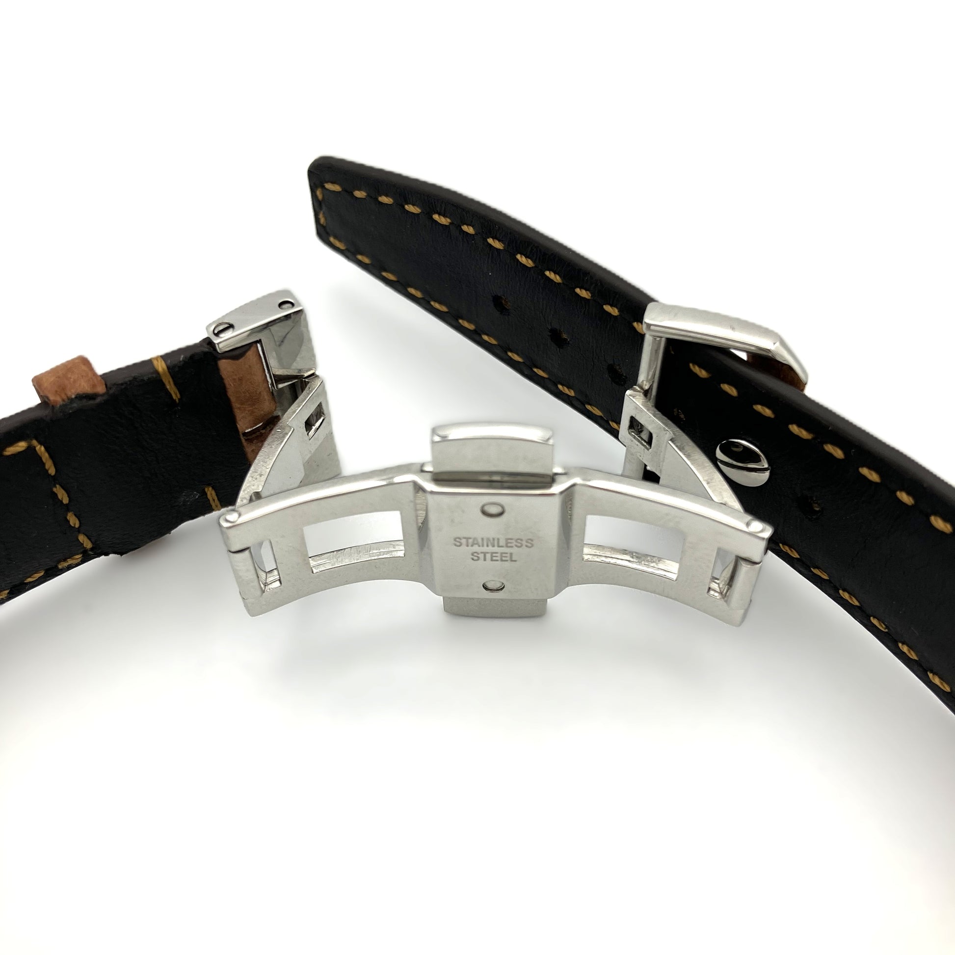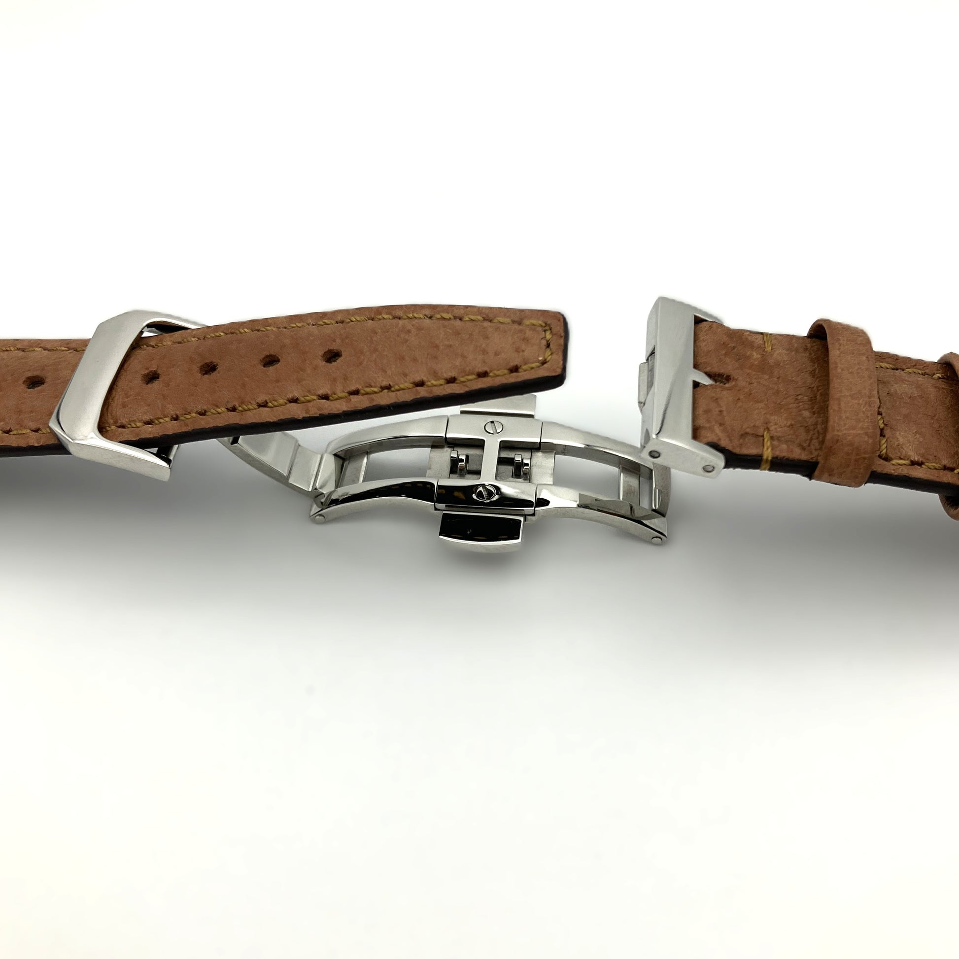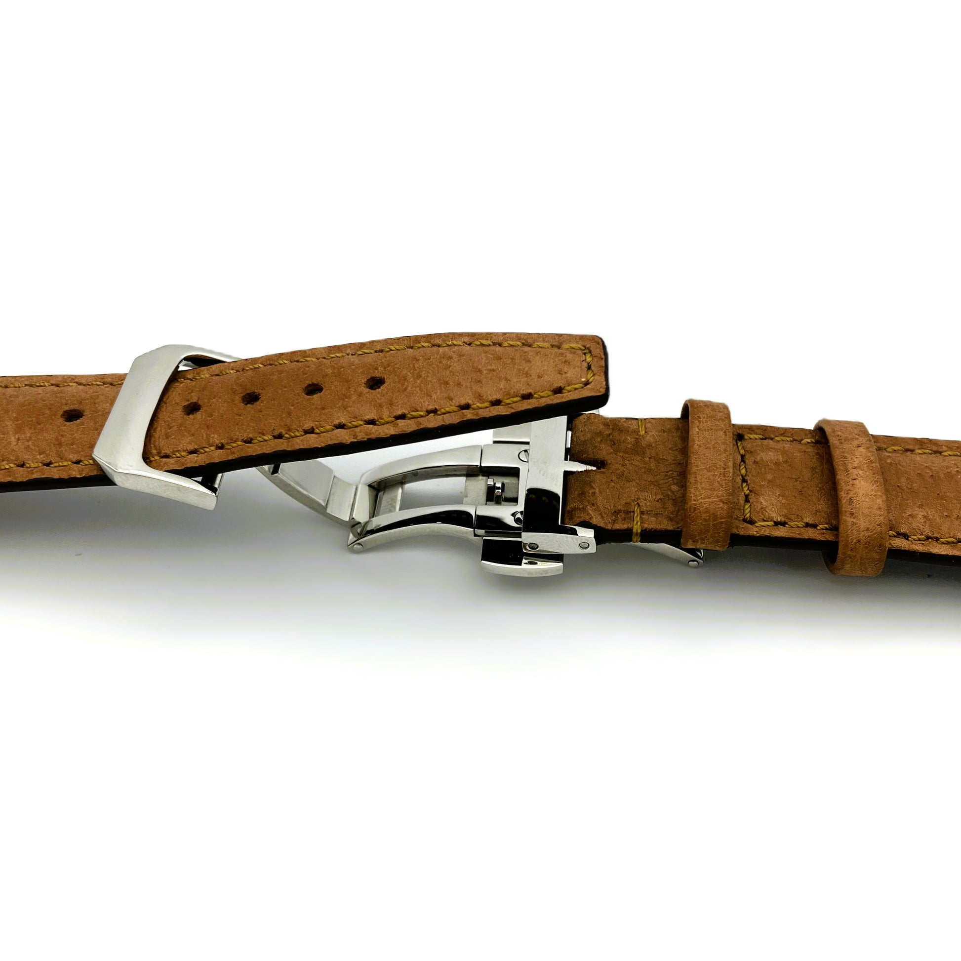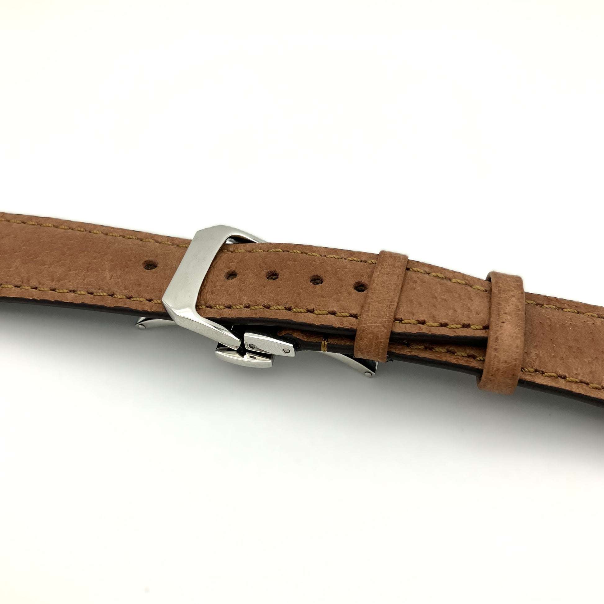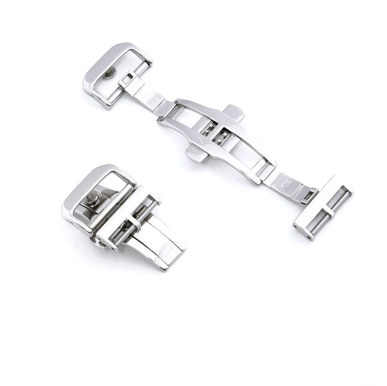 Perhoslukko/taittolukko sivupainimilla nahkarannekkeelle. Lukko on valmistettu kiillotetusta ruostumattomasta teräksestä.