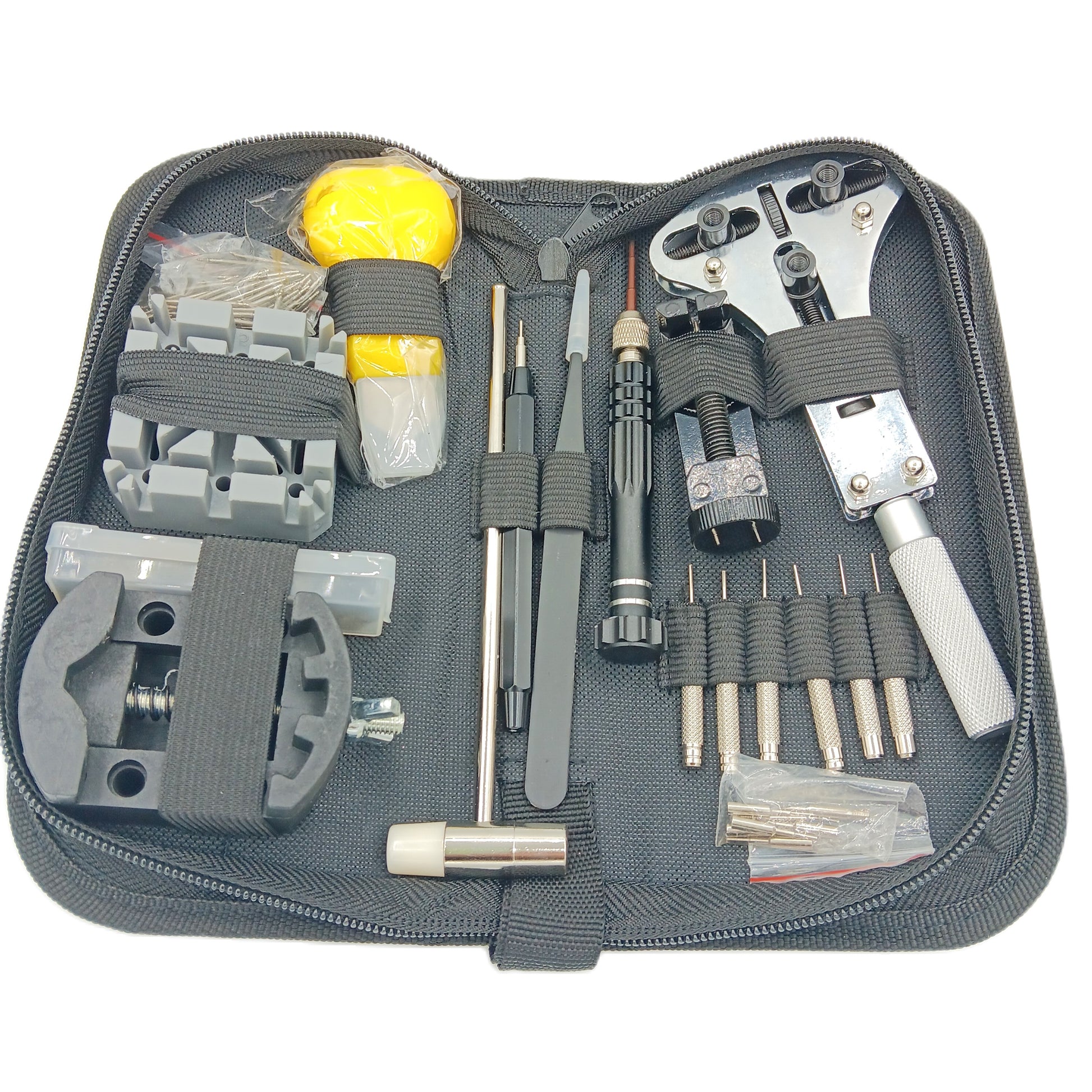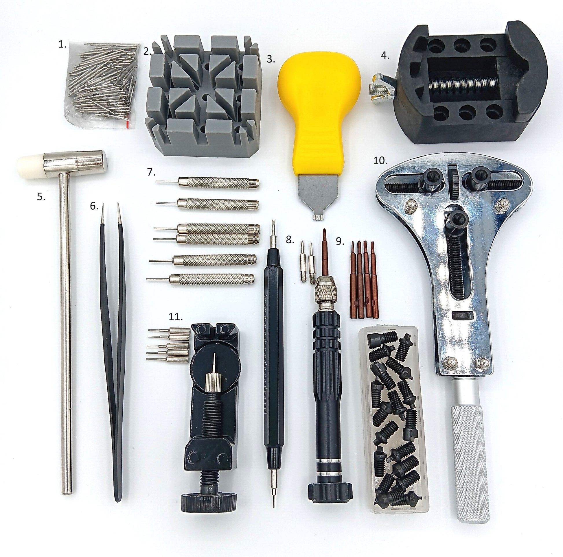 Korjaustyökalusarja kellon ja rannekkeen korjaukseen sisältäen yhteensä 153 osaa. Työkalut kulkee mukana kätevässä mustassa kantolaukussa.