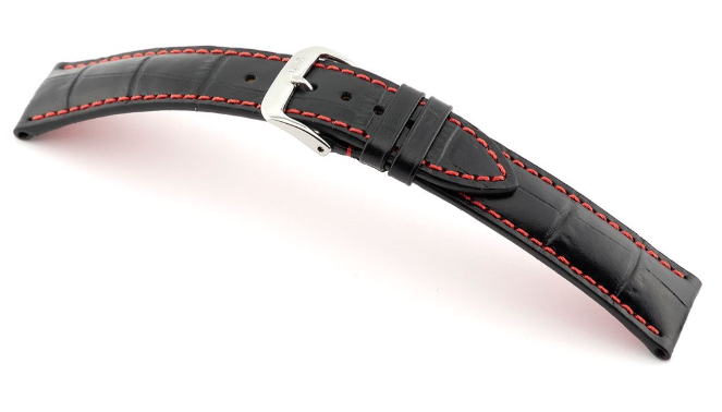 Tyylikäs Vegas -nahkaranneke on musta, topattu ranneke värillisellä tikkauksella. Ruostumattomasta teräksestä valmistetun soljen sekä lenkkien pysyvyys on taattu käsin ompelemalla. Rannekkeen päällisosa on mustaa nahkaa alligaattorikuvioinnilla ja alaosa on värillinen/saman värinen tikkauksen kanssa. Rannekkeen reunat ovat käsin hiottu ja maalattu mustaksi.